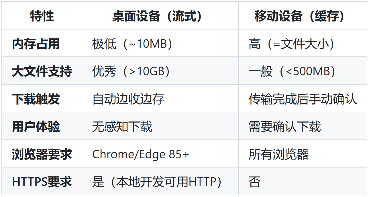 📱 移动设备:浏览器缓存模式,传输完成后统一下载(推荐<500MB)